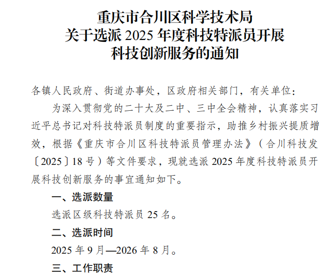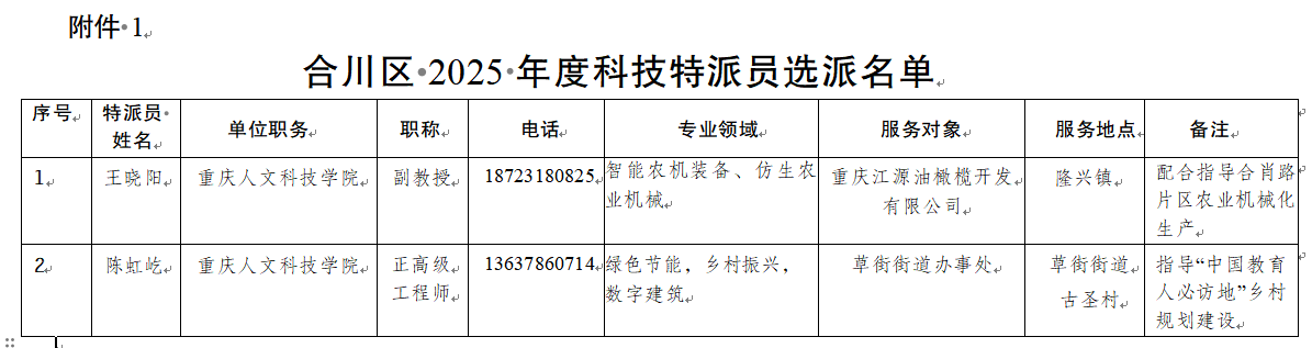 近日,重庆市合川区科学技术局发布了《关于选派2025年度科技特派员开展科技创新服务的通知》,学校王晓阳、陈虹屹两位教师被选派为区级科技特派员,这是学校教师首次入选区级科技特派员。此次重庆市合川区科技局共选派25名区级科技特派员,共有3所高校的4名教师入选,我校是唯一一个入选两名教师的高校。