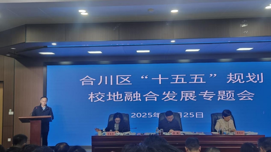 12月25日,合川区“十五五”规划校地融合发展专题会顺利召开。区委副书记秦敏参加会议并讲话,区政府副区长袁晓钦主持会议,合川区发展改革委、区教委等相关职能部门负责人以及在合高校代表80多人参加。会议旨在谋划区域未来产业发展战略,深化产教融合、校地合作。学校作为在合高校代表深度参与会议全过程,积极建言献策,充分展示了服务区域发展的担当与作为。